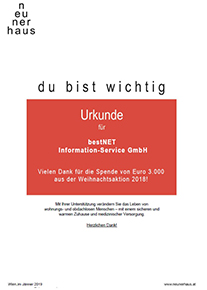 ![]() | Im Rahmen unserer Weihnachtsaktion haben wir dank der vielen neuen KundInnen eine Spende in Höhe von EUR 3.000,- an das "neunerhaus" überweisen können. Das neunerhaus Gesundheitszentrum bietet für obdachlose und nicht versicherte Menschen einen niederschwelligen Zugang zu Allgemeinmedizin, Zahnmedizin, Augenheilkunde, Pflege sowie Sozialer Arbeit. Herzlichen Dank an unsere KundInnen, die das ermöglicht haben! Ihr bestNET.Team |